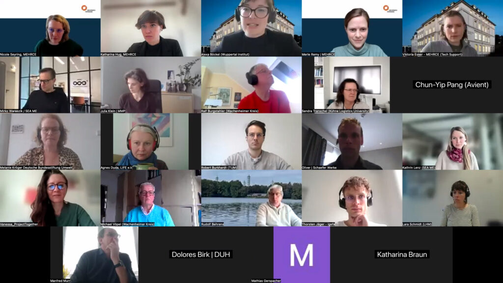 Das Wuppertal Institut entwickelt eine Systems Map, die Herausforderungen und systemische Zusammenhänge zwischen den einzelnen Akteuren sichtbar macht. Sie zeigt, wo Umsetzungsbarrieren liegen und welche Ansatzpunkte für Veränderung daraus resultieren. Die Leuphana Universität Lüneburg und die Kühne Logistics University in Hamburg begleiten die Community mit Interviews, Evaluationen und wissenschaftlichen Analysen. So wird untersucht, wie die MEHRCE-Community funktioniert und welchen Beitrag sie zur Transformation leisten kann. Grundlage bilden unter anderem 30 bis 40 Interviews, Beobachtungen sowie die Erarbeitung einer IOOI-Logik (Input–Output–Outcome–Impact) für die Community. Ergänzend entstehen mehrere wissenschaftliche Publikationen, die die Entwicklung der Innovationscommunity dokumentieren und analysieren.