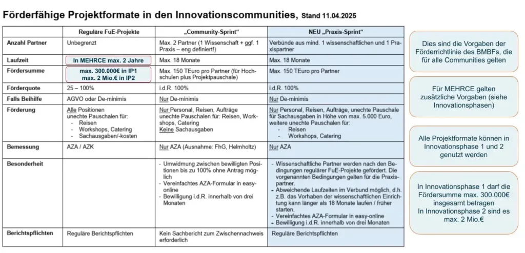 MEHRCE ist eine von zwanzig Innovationscommunities, die im Rahmen der BMBF DATIpilot Förderrichtlinie gefördert werden sollen. Die Förderrichtlinie finanziert sowohl ein Communitymanagement und Communityprojekte im Rahmen von insgesamt 4 Mio. € innerhalb einer Community. Die Laufzeit des Projekts ist vom 01.02.2025 bis 31.12.2028 geplant.