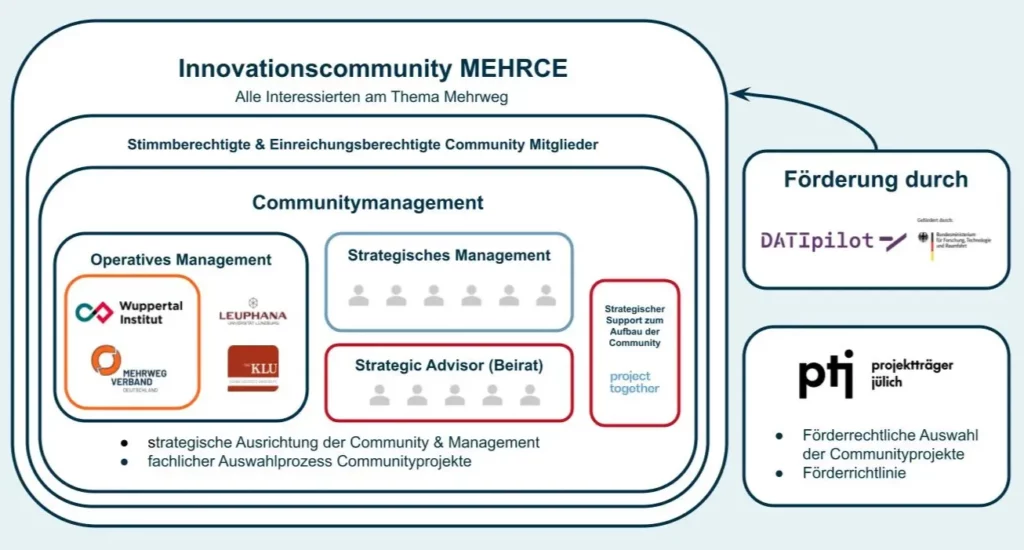 Die Verantwortung für die Begleitforschung ist bewusst verteilt: Während die Universitäten für die wissenschaftliche Aufarbeitung und Lehrmaterialien zuständig sind, liegt beim Wuppertal Institut die Analyse systemischer Herausforderungen. Insgesamt ist die Begleitforschung ein zentraler Bestandteil der Förderrichtlinie DATI. Sie stellt sicher, dass die im Projekt gewonnenen Erkenntnisse dokumentiert, ausgewertet und für die Weiterentwicklung von Mehrwegsystemen nutzbar gemacht werden. Auch die Frage nach der Gestaltung von Innovationscommunities wird in den Fokus genommen. So wird nicht nur die Qualität und Nachvollziehbarkeit der Projektarbeit gestärkt, sondern auch die strategische Ausrichtung der Community unterstützt.